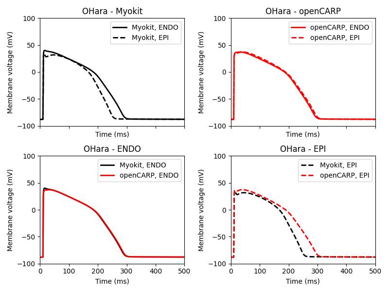 Comparing the endocardial and epicardial simulations in the O'Hara model from openCARP and Myokit (bottom panels), it seems the O'Hara model provided in openCARP does not correctly simulate epicardial AP.